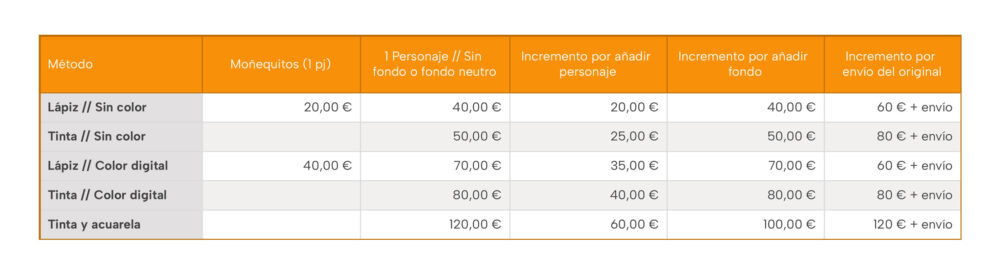 Aquí tienes una tabla de precios con las opciones básicas. Si lo que buscas no encaja del todo en este planteamiento, podemos ajustarlo una vez empecemos a hablar del encargo.