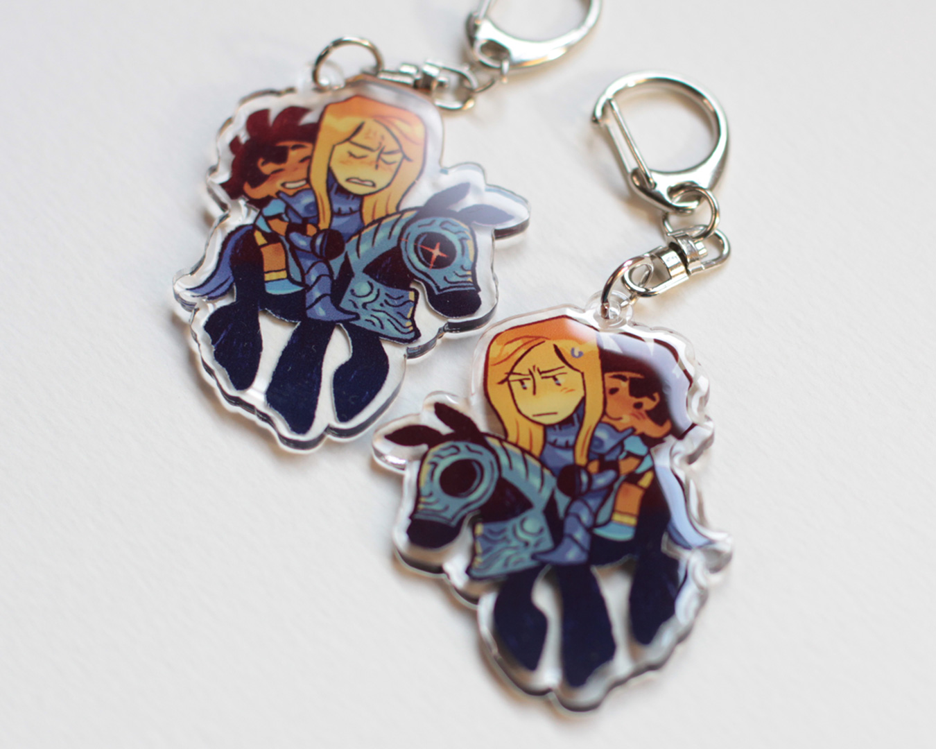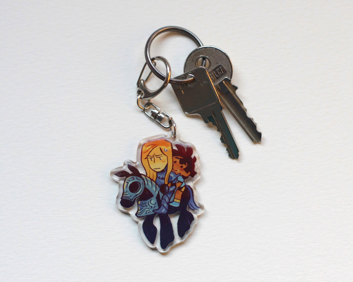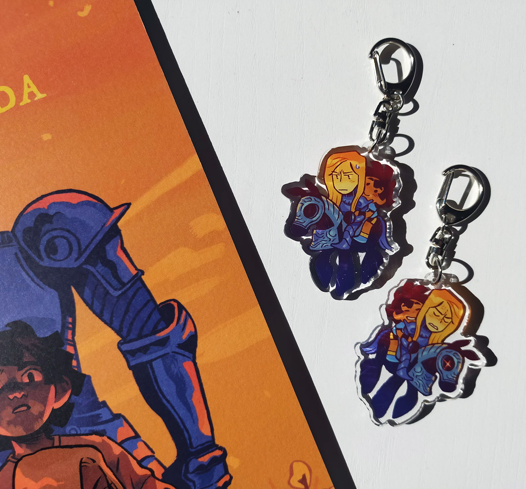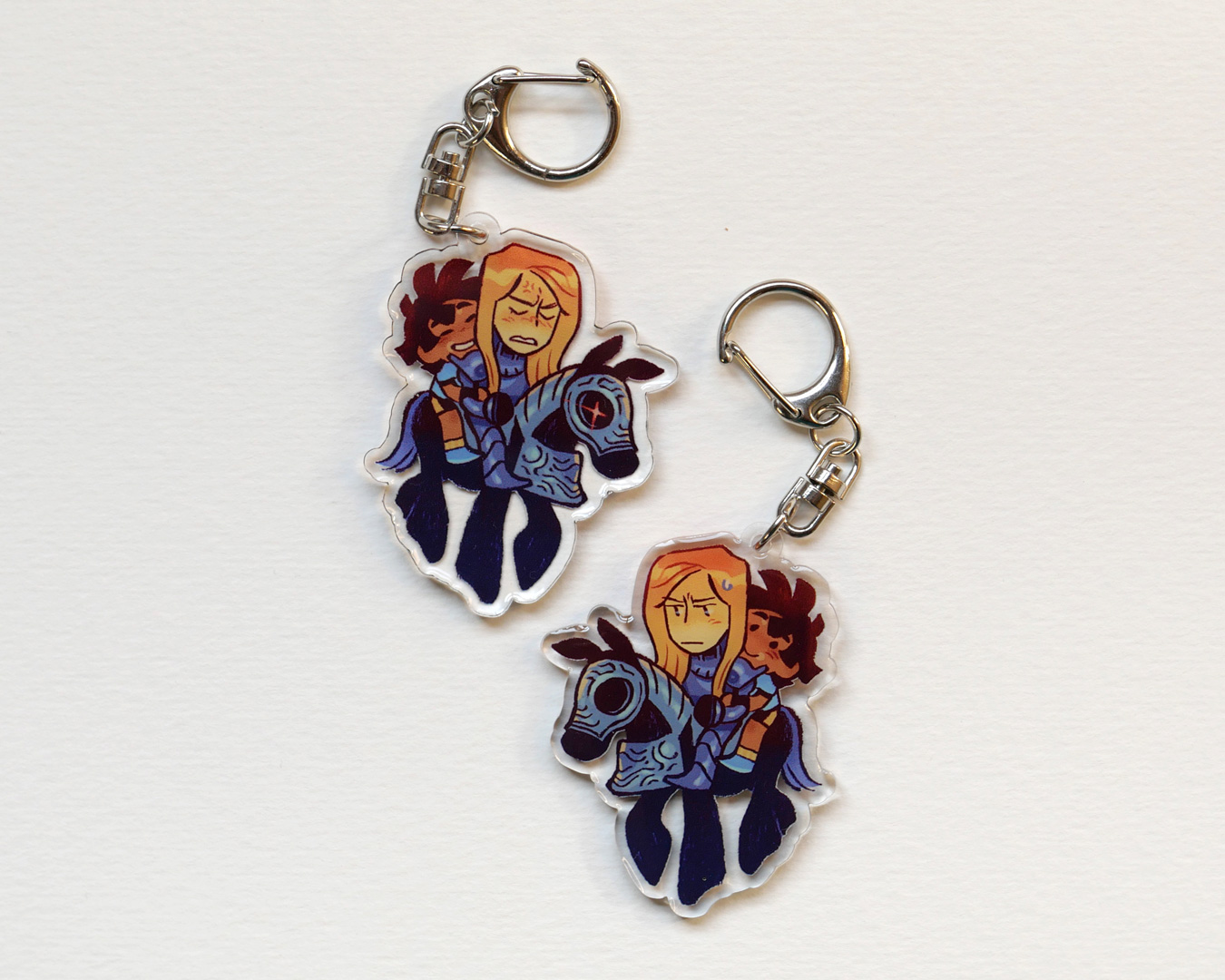 Acrylic charm of Sierra, Olivia and the horse, from my comic I see a knight.
